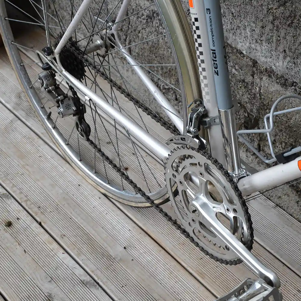 Nous ne repeignons pas les cadres : chaque vélo conserve sa patine d’origine, avec ses marques du temps. On les nettoie et on les lustre avec soin, sans effacer leur histoire. Prenez le temps de bien regarder les photos avant de craquer sur ce vélo demi-course Peugeot.