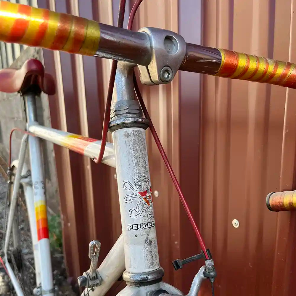 Nous ne repeignons pas les cadres : chaque vélo conserve sa patine d’origine, avec ses marques du temps. On les nettoie et on les lustre avec soin, sans effacer leur histoire. Prenez le temps de bien regarder les photos avant de craquer sur ce vélo vintage Peugeot blanc.
